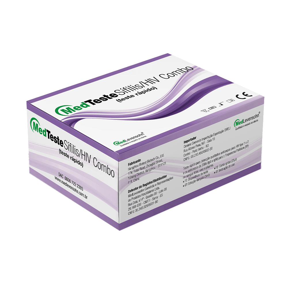 O HIV (Vírus da Imunodeficiência Humana) é o agente causador da Síndrome da Imunodeficiência Adquirida (AIDS). Ele ataca o sistema imunológico, diminuindo as defesas naturais do organismo e propiciando, por consequência, o desenvolvimento de doenças oportunistas como infecções.A sífilis é uma infecção de caráter sistêmico, causada pelo Treponema pallidum (TP), que se não tratada precocemente pode evoluir para uma condição crônica com sequelas irreversíveis a longo prazo. O principal sintoma se dá por meio do aparecimento de uma ferida, geralmente indolor, que aparece entre 10 e 90 dias após a infecção na região genital.Ambas as doenças podem ser transmitidas através de relação sexual desprotegida, ou ainda, pelo compartilhamento de objetos contaminados e de mãe para filho durante a gestação, parto ou amamentação.O MedTeste Sífilis/HIV Combo é um teste rápido qualitativo, baseado na membrana para detectar anticorpos para HIV 1,2 e sífilis no sangue total, soro ou plasma. Realizado de maneira segura, seu resultado é obtido em apenas 10 minutos.• Teste rápido para a detecção qualitativa de anticorpos contra o HIV tipo 1, tipo 2 e anticorpos contra sífilis (IgG e IgM) para o Treponema Pallidum (TP)• Amostra: sangue total, soro ou plasma• Resultado em 10 minutos• Simples e fácil – resultado no próprio cassete• Praticidade – dois resultados no mesmo dispositivo• Alta sensibilidade e especificidade• Conteúdo: 10 ou 25 dispositivos de teste, 10 ou 25 conta-gotas, 1 solução tampão e 1 instrução de uso• Registro Anvisa: 80560310020